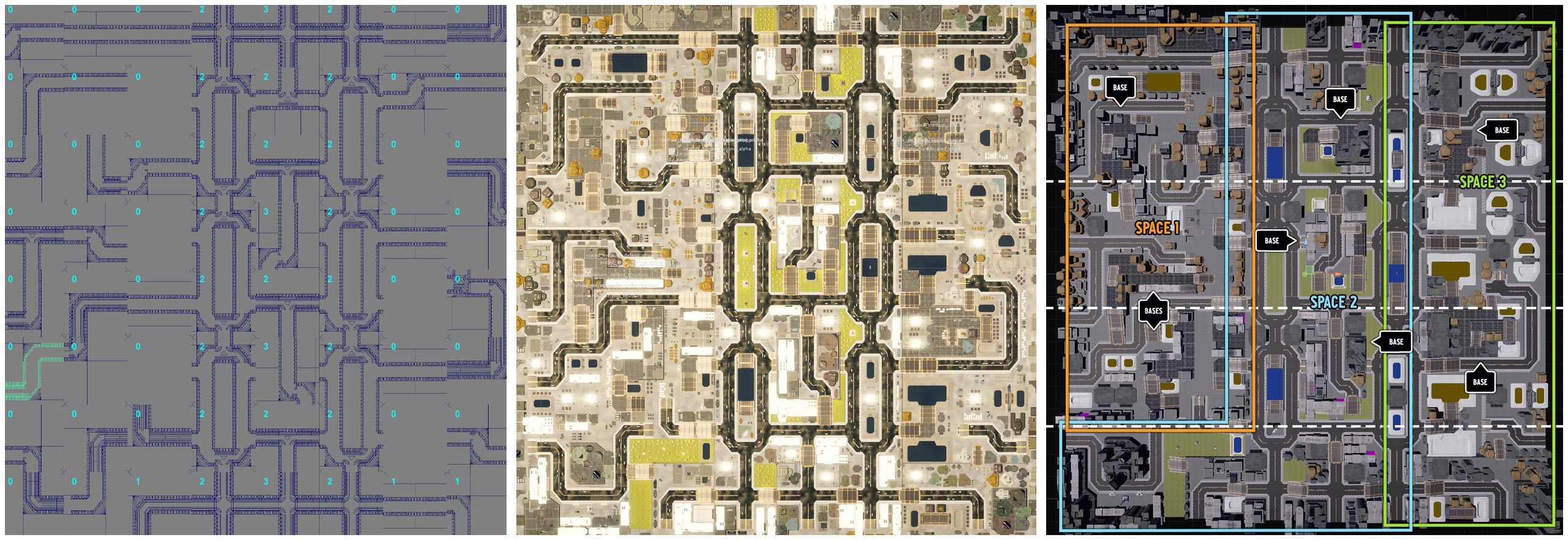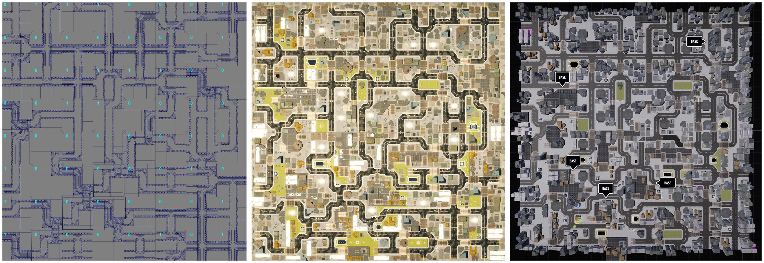 ABOVE: This shows the process of designing “Power Structure”, from left-to-right. I laid out the initial roadwork in our custom tool as this was the most fundamental component that the rest of the map would need to be built around. Next, I filled in the broad green spaces and water areas which was then hand-populated with buildings to remove empty spaces and create routes. Finally, procedural elements were added that could be controlled by the selected mission and notated for the art team for set dressing and QA for testing.