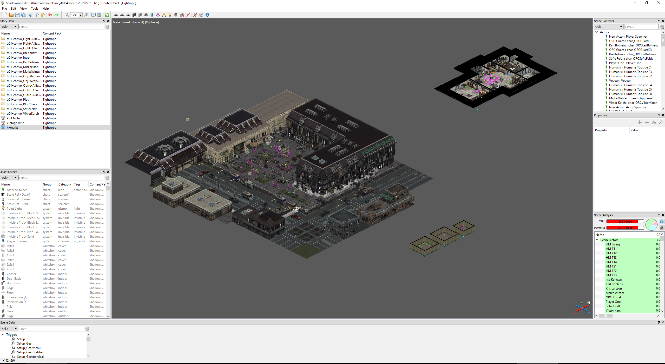 After plotting some of the background context for my scenario, I created a workflow as a rough map for how the player choice and events would progress. I began roughing out my level layouts using the visual mode of the Shadowrun Editor. I setup triggers and checks for the logic scripting, of which there are dozens even for this relatively simply mission. Using the branching dialog editor, I began to create the various conversation trees for NPCs players would interact with. Many of these set flags which are then used to unlock/lock additional convo options or even new actions.