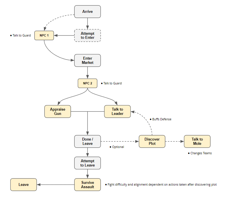 I try to use narrative asides in my descriptions for more detail as well as using requirements-based dialog options to help players feel their skill assignments are useful. This is the second area the player explores, and contains most of the important dialogue along with the key branching decision path.